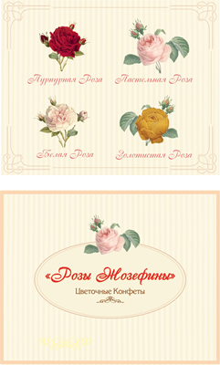Набор из 4-х конфет "Розы Жозефины" сделаны из бельгийского шоколада по авторской рецептуре на основе легенды "Сад Жозефины Богарне". Каждая конфета в наборе имеет собственное название и вкус начинки: "Бордовая роза" - анисовый шлейф, в начинке вишня, вымоченная в амаретто и водке; "Розовая роза" - тонкий вкус клубники и шампанского брют; "Персиковая роза" - нежная начинка со шлейфом кориандра, аниса,
