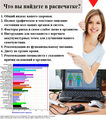 Обследование проводится по 40 точкам пальцев рук и ног в течение 10-15 минут. Безопасно, безболезненно. Сразу после процедуры выдается цветная распечатка с полным текстовым и графическим описанием состояния клиента, рекомендациями по питанию и точечному массажу. Определяются системы организма, находящиеся в зоне риска.
