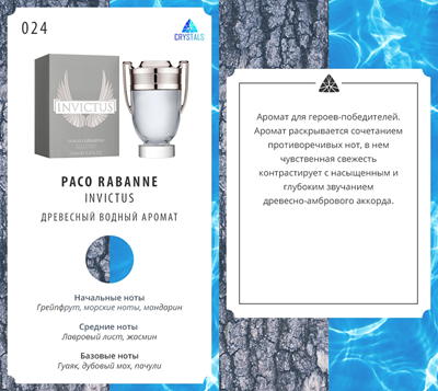 я нотка: гуаяк, дубовый мох, пачули. Проявляется через 40-60 минут, звучит 4-5 часов, а в некоторых ароматах 6-8 часов. Емкость флаконов - 50 мл. в наличии также имеются по 15 мл. Под заказ 2-4 дня. Предопл