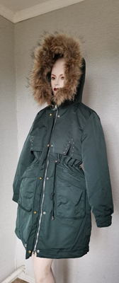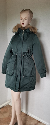 Куртка-пуховик. Длина чуть выше колена. Мех на капюшоне-натуральный. Застёжка-замок и клёпки. Кулиска по линии талии. Цвет зелёный. Размеры L (165, 88А ), XL (170,92А), XXL (175,96А).