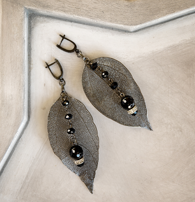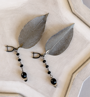 Серьги изготовлены из скилетированных листьев.