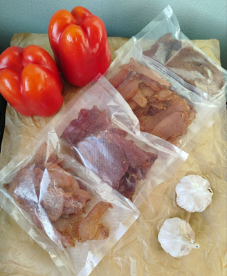 Домашнее производство: Сушёных деликатесов в дегидраторе ( джерки) из свинины и курицы.