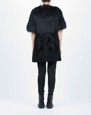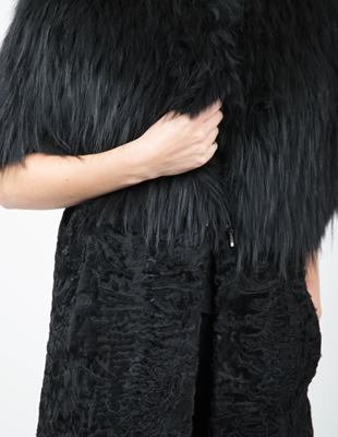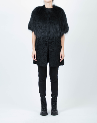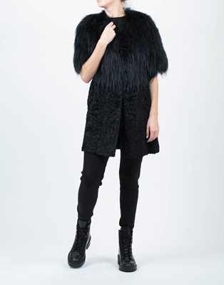 Шикарный жилет характеризуется сочетанием меха енота и меха каракуля с характерными завитками. Объемная кокетка из меха енота может носиться отдельно, т.к. отстегивается. Изделие имеет комфортную трикотажную подкладку из смеси шерсти и кашемира, не имеет застежки. Жилет выполнен в стиле Smart Casual, благодаря чему Вы сможете создавать как классические, так и кэжуальные образы.