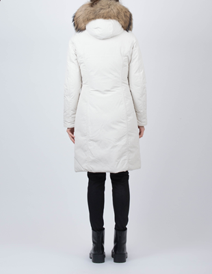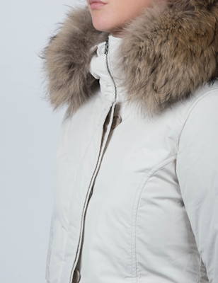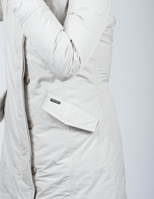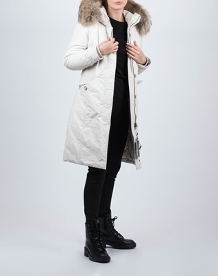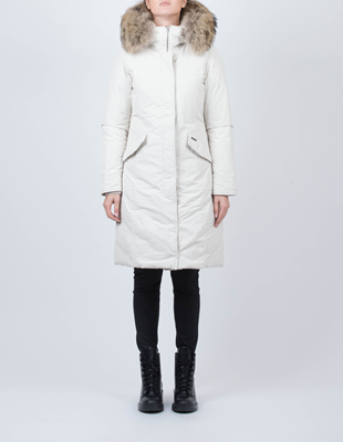 Стильный пуховик A-силуэта из коллекции Woolrich. Модель изготовлена из тончайшей фирменной ткани с особенной отделкой, защищающей от снега, дождя и ветра. Модель утеплена пухо-перьевым слоем и украшена на капюшоне мехом. По бокам прорезные карманы с клапанами, внутри стеганая мягкая подкладка.