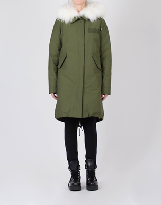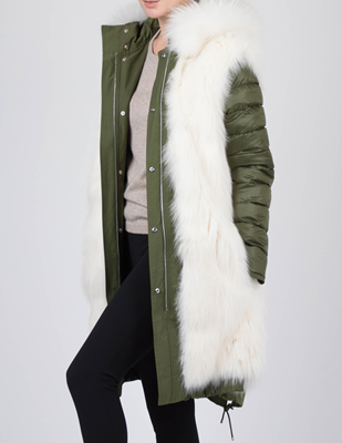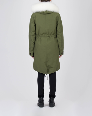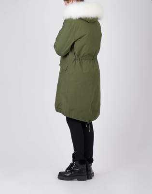 Стильная двусторонняя женская парка Yves Salomon выполнена из плотного хлопка, дополненного мехом лисы белого цвета. Модель свободного кроя с кулиской с оборотной стороны, благодаря которой можно сделать приталенный силуэт. Глубокий капюшон оформлен опушкой из меха. По бокам прорезные карманы с клапанам