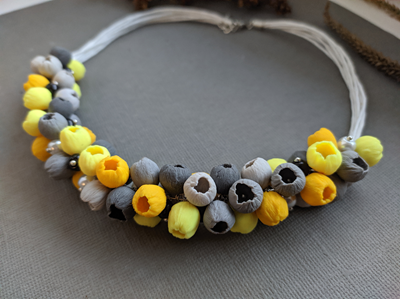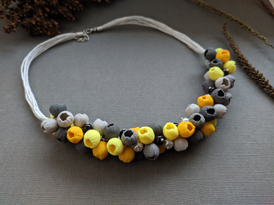 Состав: бутоны из полимерной глины, стеклянные бусины, вощеный шнур, металлическая фурнитура.