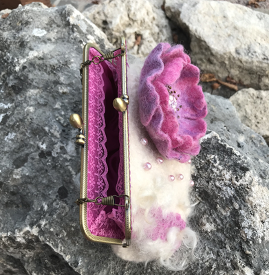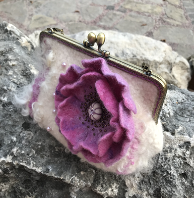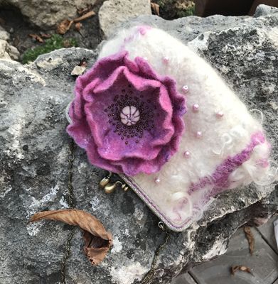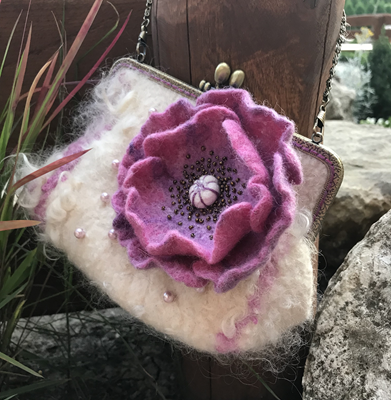 Сумочка сваляна из шерсти меринос и флиса готланд ,украшена валяным цветком и расшита бусинами и бисером. Имеет подкладку,фермуар-застежку и цепочку .Размер 17х25 см ,длина цепочки 120см