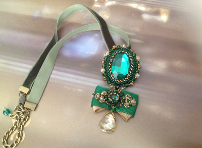 Материалы: хрусталыные элементы Swarovski, чешские кристаллы, японский бисер, стеклянные бусины, репсовая и бархатная лента, металлическая цепочка, застежка.