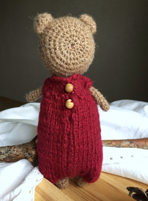 Он уютно помещается в ладошке, это маленький друг, которого можно использовать как для активной игры, так и в качестве интерьерной куклы. Комбинезон с Медвежонка снимается и одевается, сзади комбинезон застегивается на пуговички-бусинки из древесины можжевелового дерева.