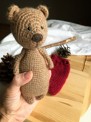 У каждой, связанной мной игрушки, свой характер, этот Медвежонок получился очень добрым и практичным, ему нужен очень ответственный, добрый и заботливый хозяин.