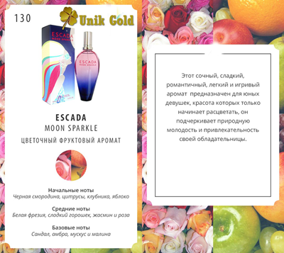 Верхние ноты: черная смородина, цитрусовые, земляника, расное яблоко. Очень интенсивный аромат, который ощущается сразу же после нанесения. Этот эффект длится от нескольких секунд до 15 минут.