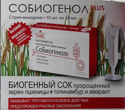 «СОБИОГЕНОЛ plus » - нативный сок ростков пшеницы, содержащий полный комплекс биоактивных компонентов в неизмененной естественной природной форме, обладающей биологической совместимостью с клетками и тканями организма, абсолютным проникающим в кровяное русло действием, полной растворимостью, биодоступностью, регулирующим действием на биохимические процессы эндокринной, иммунной, нервной, пищеварительной,