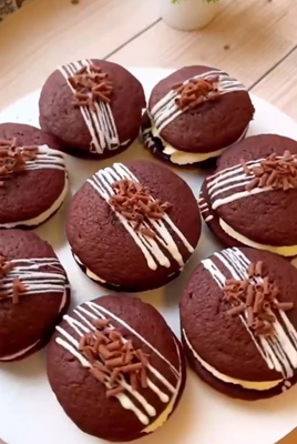 Шоколадные бисквиты с кремом чиз (сливки 33% + сыр (творожный или сливочный) + сахарная пудра) и начинкой из ягодного(фруктового) конфи.