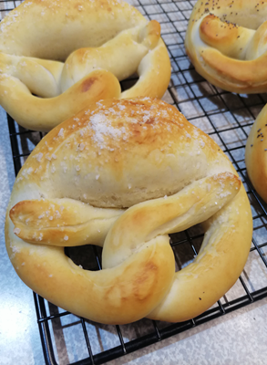 Хлебобулочные изделия, мягкие внутри и хрустящие снаружи. Брецель сам по себе соленый, без сахара. Обсыпка