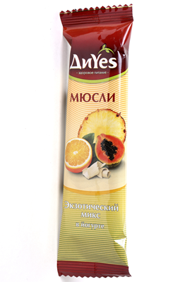Состав: мальтозный сироп, йогуртовая глазурь (сахар, растительный жир, молочная сыворотка, йогуртовый порошок, эмульгатор: соевый лецитин, регулятор кислотности лимонная кислота, ароматизатор натуральный), овсяные хлопья, сушеный ананас, экструдированные злаковые шарики (пшеничная, рисовая и кукурузная мука, пшеничная клетчатка, соль), кукурузные хлопья, сушеная папайя, фруктовые кусочки Апельсин (апельсин, яблоко, глюкозно-фруктозный сироп, влагоудерживающий агент: глицерин, агент желирующий: пектин), растительный жир (рапсовое масло, соевое масло), глюкозно-фруктозный сироп, эмульгатор: соевый лецитин, регулятор кислотности: лимонная кислота, ароматизатор.