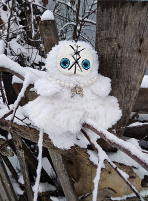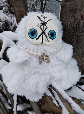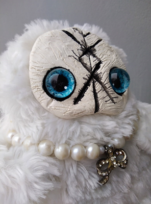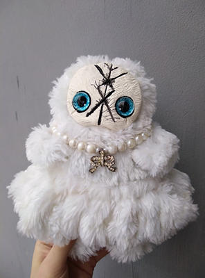 Мягкое тело, мося из глины, глаза стекло. Бусы из искусственного жемчуга.