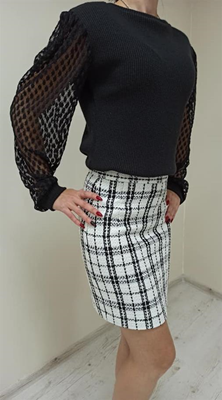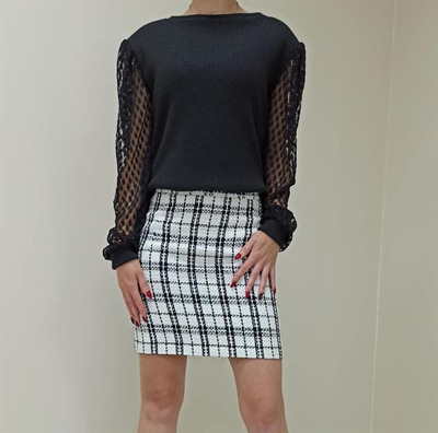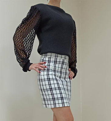 Ангоровый свитер с рукавами из итальянского гипюра прекрасно гармонирует с юбкой твид.