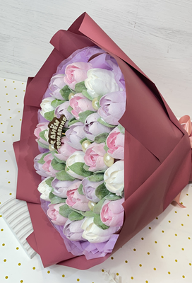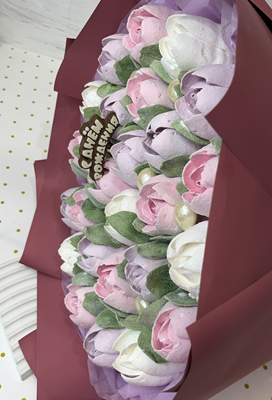 В букете 25-27 крупных махровых тюльпанов из зефира.
