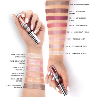 Тени быстро высыхают, сохраняют яркость цвета и сияния до 12 часов. Абсолютно легкие и невесомые, не ощущаются на веках.